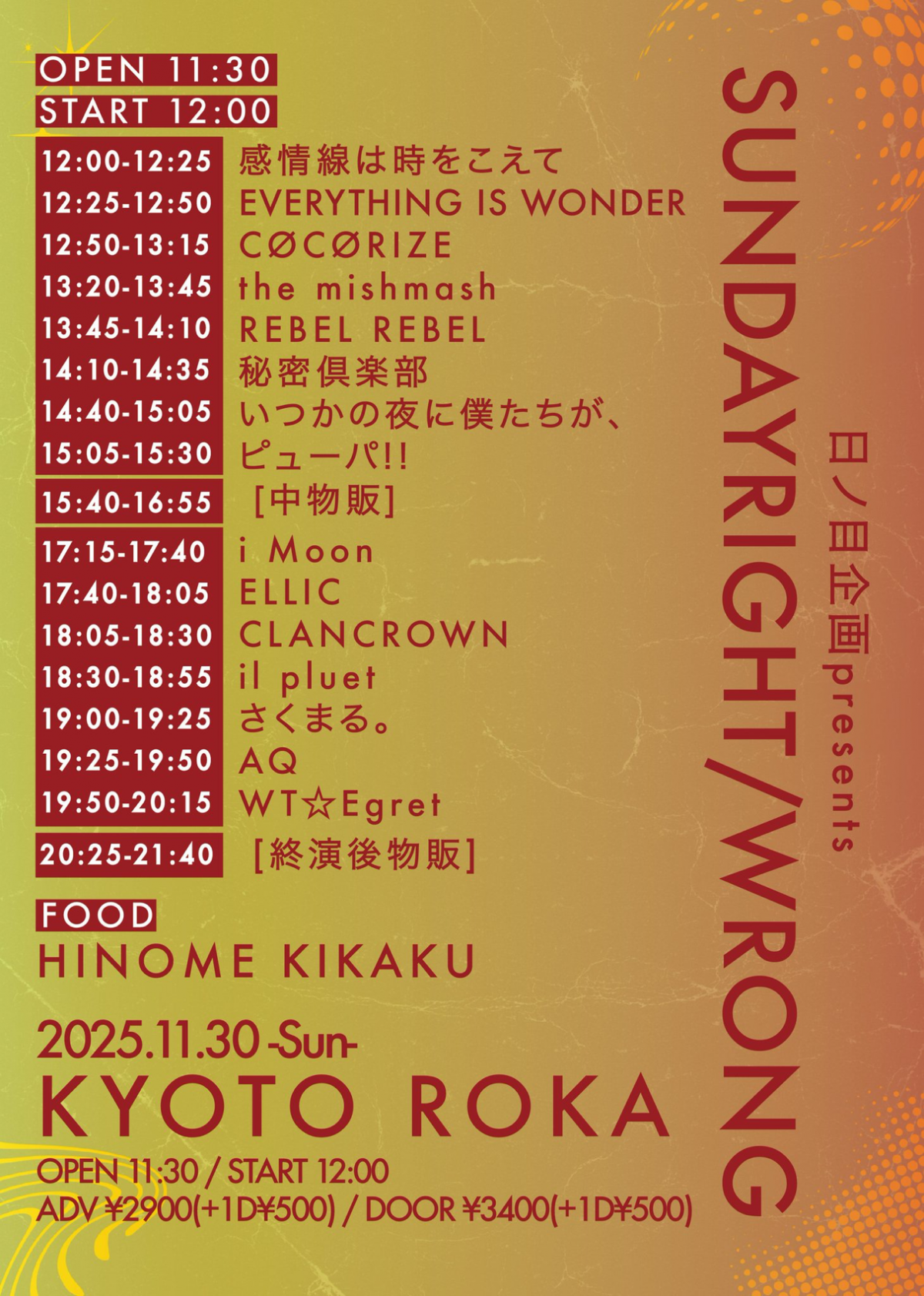 前売り:¥2,900 当日:¥3,400 Drink:¥500 -