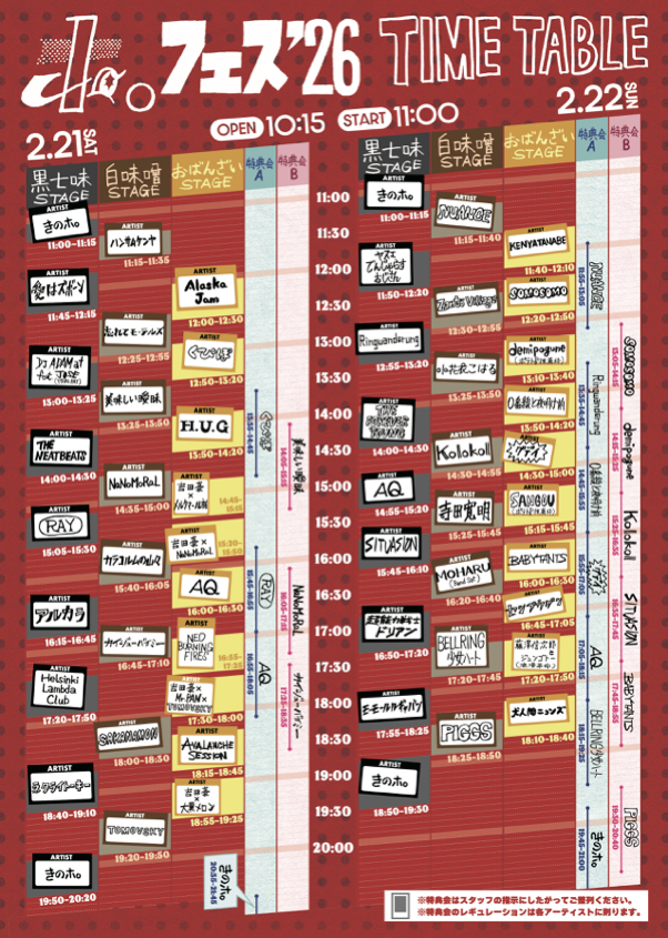 きのホ。 / 愛はズボーン / Alaska Jam / Avalanche Session / アルカラ / AQ / 美味しい曖昧 / カイジューバイミー / カラコルムの山々 / くぴぽ / SAKANAMON / THE NEATBEATS / DJ ADAM at feat.Jose(TOTALFAT) / TOMOVSKY / NaNoMoRaL / NEO BURNING FIRES / ネクライトーキー / H.U.G / ハンサムケンヤ / Helsinki Lambda Club / 吉田豪 / RAY / 忘れてモーテルズ -