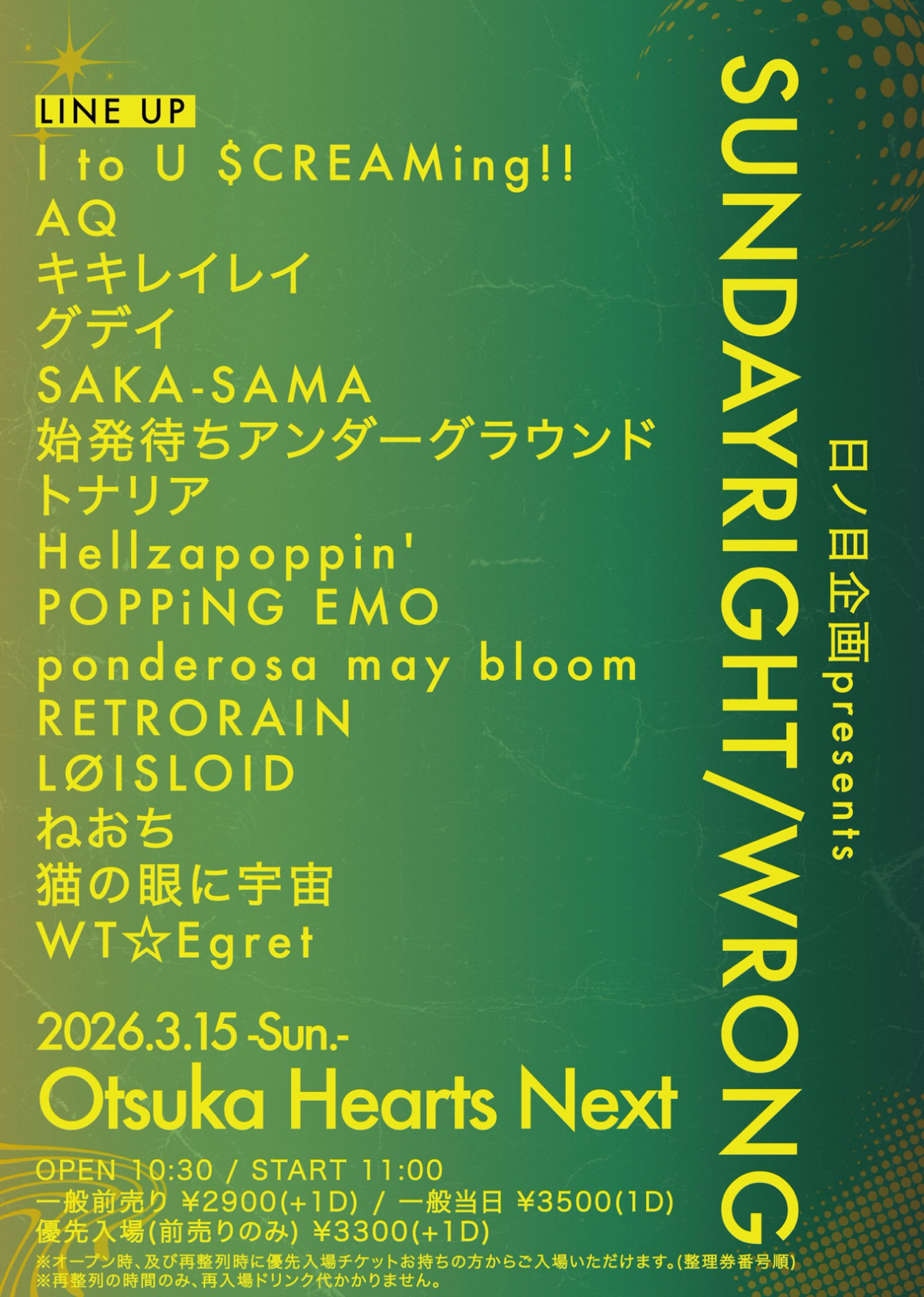 I to U $CREAMing!! / AQ / キキレイレイ / グデイ / SAKA-SAMA / 始発待ちアンダーグラウンド / トナリア / Hellzapoppin’ / POPPiNG EMO / ponderosa may bloom / RETRORAIN / LØISLOID / ねおち / 猫の眼に宇宙 / WT☆Egret -