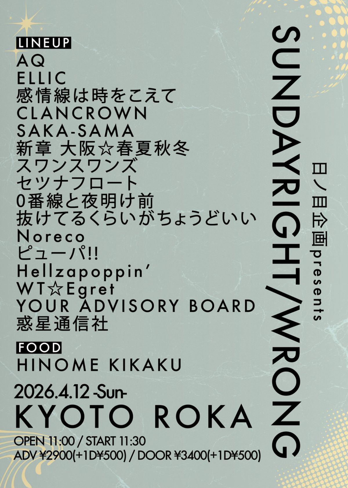 前売り:¥2,900 当日:¥3,400 Drink:¥500 -